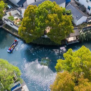 在浙江省長(zhǎng)興縣龍山街道渚山村,保潔人員進(jìn)行日常河道護(hù)理巡查(2020年4月9日攝,無(wú)人機(jī)照片)。新華社記者 徐昱 攝