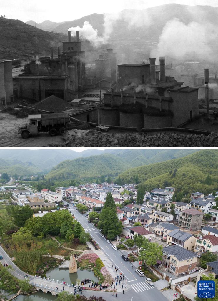 拼版照片:上圖為浙江省湖州市安吉縣天荒坪鎮(zhèn)余村二十世紀八十年代的資料照片;下圖為2018年4月24日,游客在整修一新的余村游覽(新華社記者翁忻旸攝)。新華社發(fā)