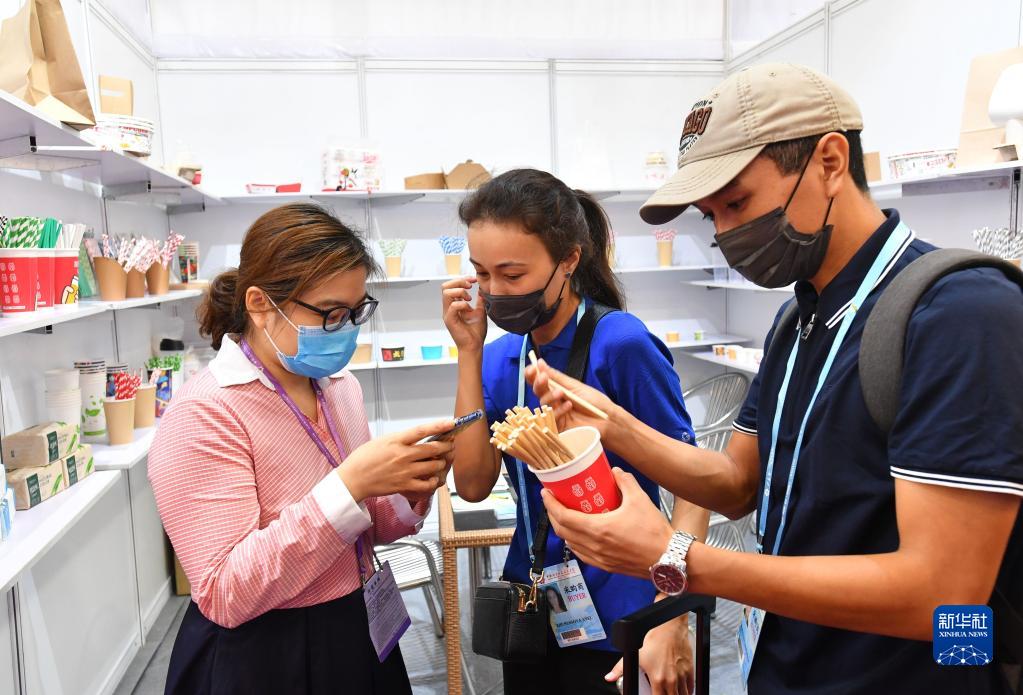 10月15日,兩名來自哈薩克斯坦的采購商(右、中)在第130屆廣交會環(huán)保吸管展臺洽談。新華社記者 劉大偉 攝