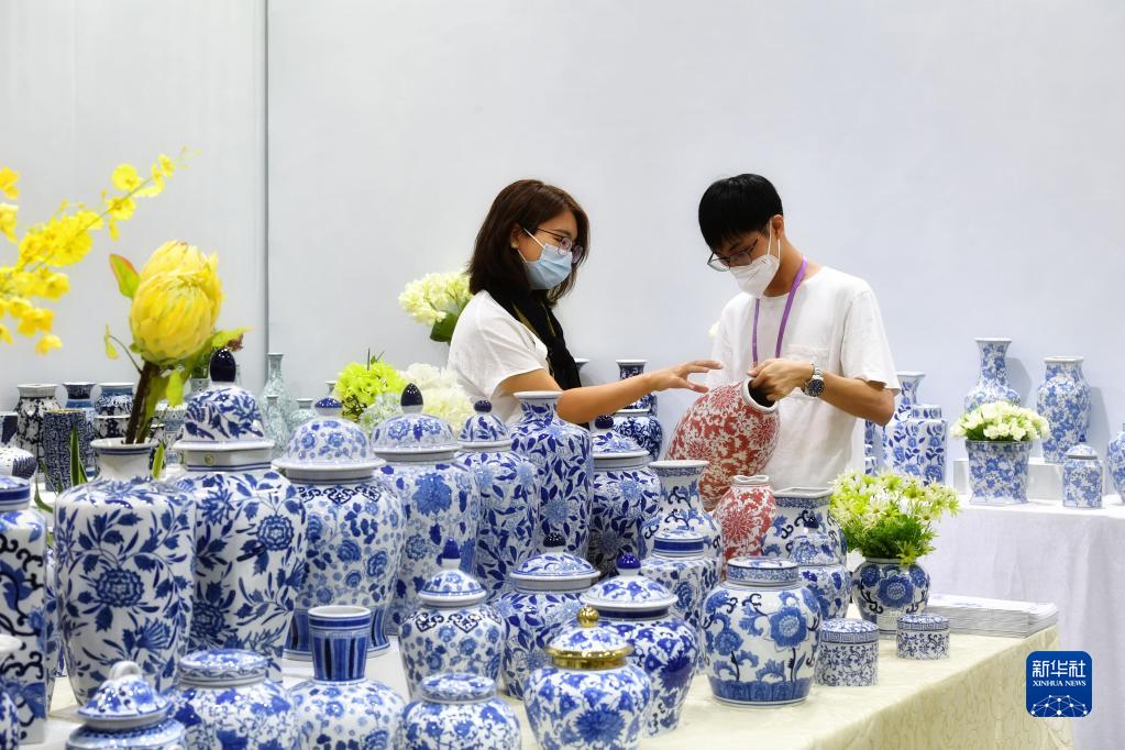 10月15日,一名國內(nèi)采購商(左)在第130屆廣交會瓷器展臺洽談。新華社記者 劉大偉 攝