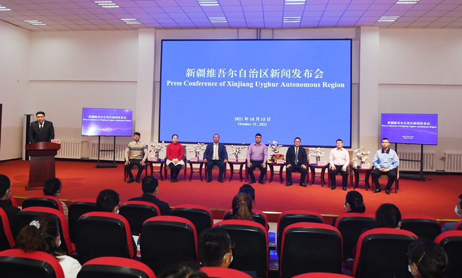 10月15日,新疆維吾爾自治區(qū)在阿克蘇地區(qū)沙雅縣舉辦棉花專場(chǎng)新聞發(fā)布會(huì)。面對(duì)媒體,伊敏·阿納耶體和其它6位來自周邊縣市的棉花從業(yè)者講述他們與棉花的故事,分享了自己的幸福密碼。