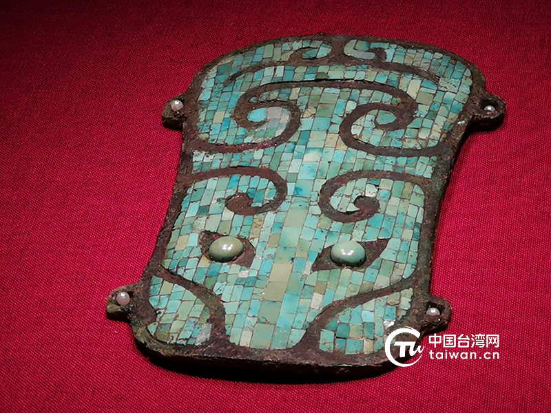 二里頭遺址出土的鑲嵌綠松石獸面紋銅牌飾。上有數(shù)百片綠松石拼合鑲嵌出獸面紋,加工精巧,絲絲入扣,雖歷經(jīng)三四千年卻無一松動脫落。(中國臺灣網(wǎng) 李杰 攝)