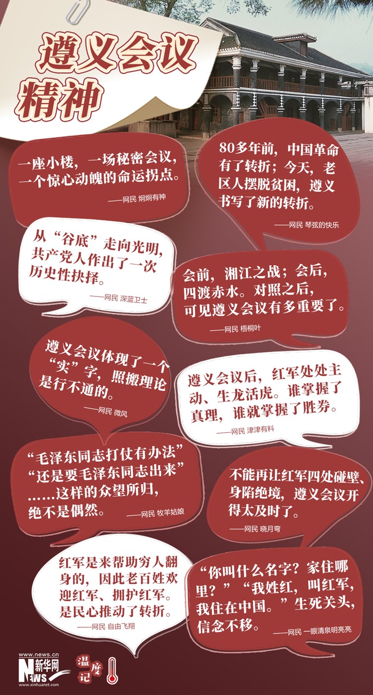 “80多年前,中國革命有了轉(zhuǎn)折;今天,老區(qū)人擺脫貧困,遵義書寫了新的轉(zhuǎn)折!本W(wǎng)民在社交平臺上的留言,講述著轉(zhuǎn)折的偉大,蘊含著精神的傳承。前進路上,還有一個又一個“婁山關(guān)”“臘子口”,我們要弘揚遵義會議精神,以飽滿斗志和必勝決心,風(fēng)雨無阻向前進。(文字:馬若虎 海報設(shè)計:王曄)