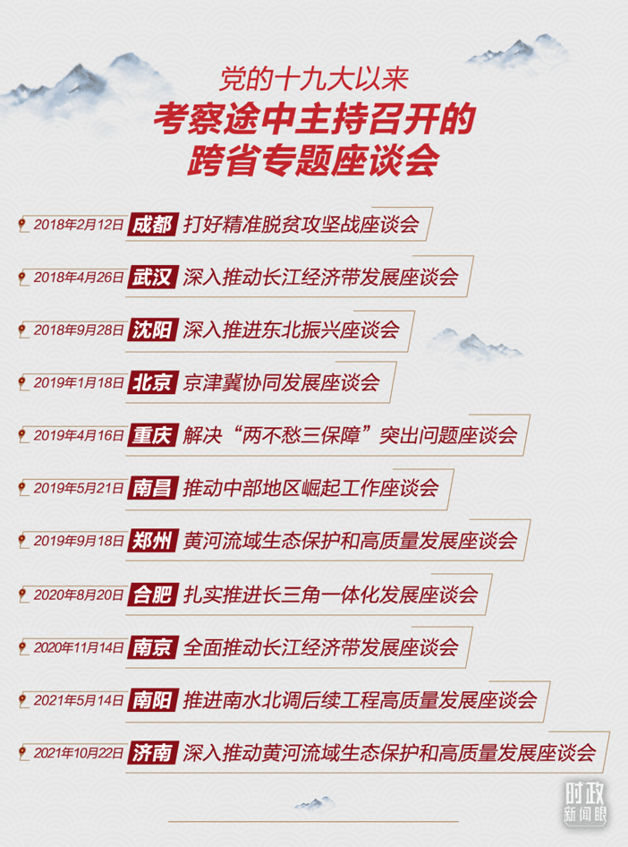 《時(shí)政新聞眼》梳理發(fā)現(xiàn),加上這次座談會(huì),黨的十九大以來(lái),習(xí)近平總書(shū)記在考察途中一共主持召開(kāi)了11場(chǎng)跨省座談會(huì)。除了3場(chǎng)聚焦脫貧攻堅(jiān)、南水北調(diào)外,其他8場(chǎng)關(guān)注的都是區(qū)域協(xié)調(diào)發(fā)展的重大戰(zhàn)略和部署。