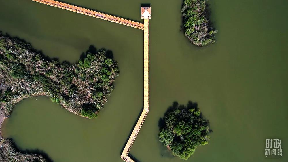 △黃河三角洲,延伸到水中的木質(zhì)棧道。(總臺(tái)國(guó)廣記者李晉拍攝)