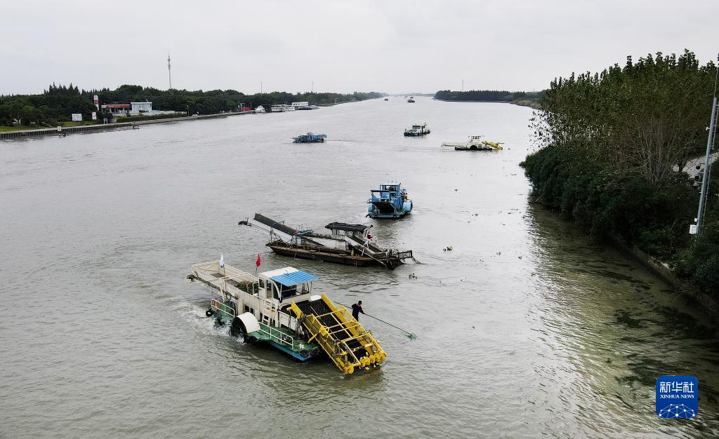 2020年10月15日,蘇浙滬三地的保潔船在太浦河水域聯(lián)合清理水面浮游植物(無人機照片)。新華社記者 方喆 攝