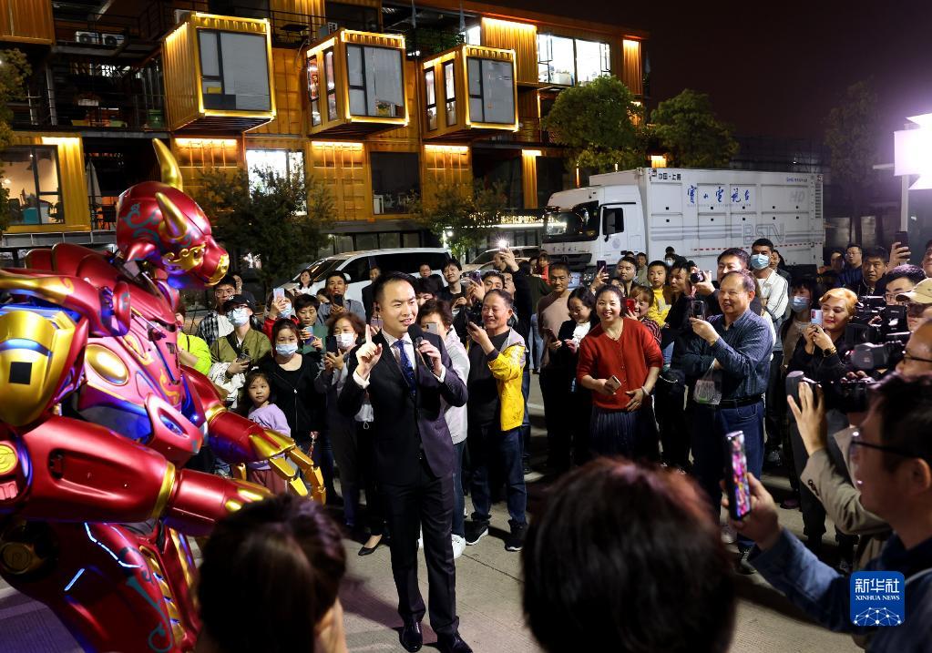 2021年4月30日,消費者在上海市智慧灣“五五購物節(jié)”活動現(xiàn)場了解導購機器人。新華社記者 陳飛 攝