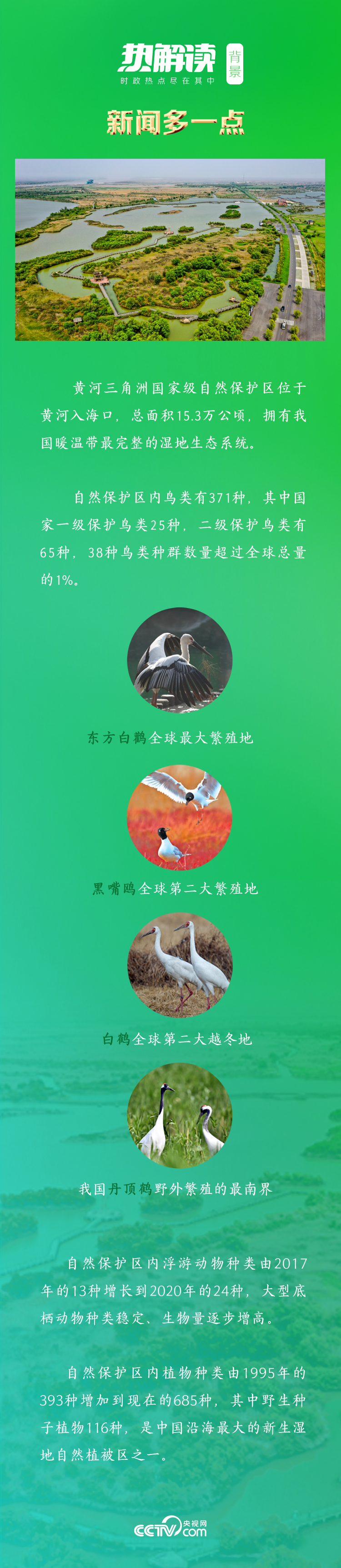 今日的黃河三角洲自然保護(hù)區(qū)生物多樣性更加豐富,野生動(dòng)物、植物分別達(dá)到1630種、685種。全球首批“國(guó)際濕地城市”的稱號(hào),是對(duì)東營(yíng)市保護(hù)和修復(fù)黃河流域生態(tài)環(huán)境的褒獎(jiǎng)。