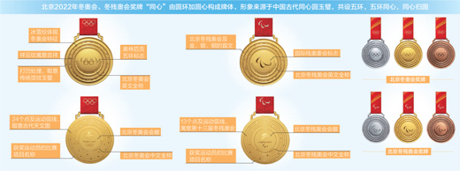 北京冬奧會獎牌“同心”由圓環(huán)加圓心構(gòu)成牌體,創(chuàng)意來源于中國古代同心圓玉璧,共設五環(huán),寓意五環(huán)同心,同心歸圓,表達了“天地合、人心同”的中華文化內(nèi)涵,也象征著奧林匹克精神將人們凝聚在一起,冬奧榮光、全球共享。