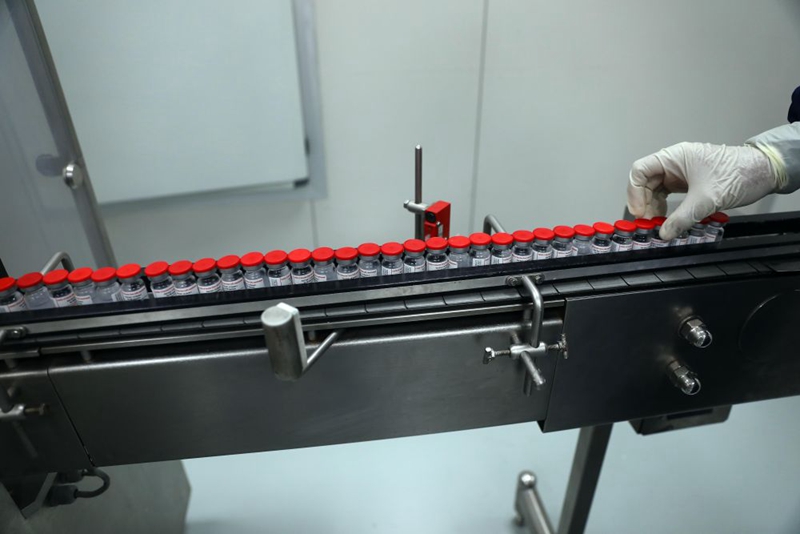 這是2021年9月6日在埃及吉薩的埃及生物制品與疫苗公司疫苗生產廠拍攝的疫苗生產線上的新冠疫苗。2021年4月21日,中國科興公司與VACSERA公司簽署在埃及生產科興新冠疫苗的協(xié)議。