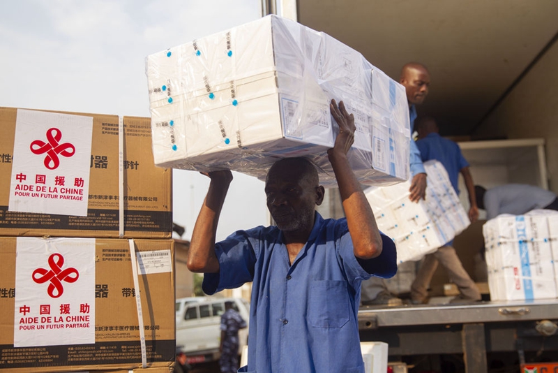 2021年10月14日,工作人員在布隆迪經(jīng)濟首都布瓊布拉卸載中國援助的國藥新冠疫苗。