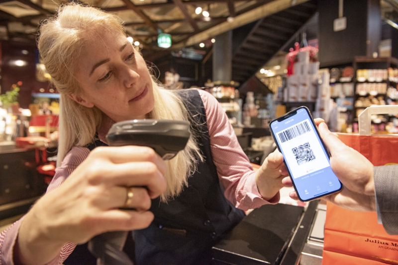 2020年1月9日,在奧地利維也納,一名咖啡店工作人員掃描一位顧客的支付寶支付二維碼。