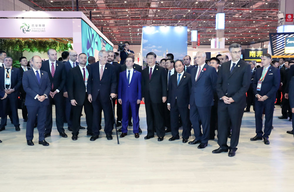 ↑2018年11月5日,習(xí)近平在上海同出席首屆中國國際進(jìn)口博覽會的外國領(lǐng)導(dǎo)人共同巡館。