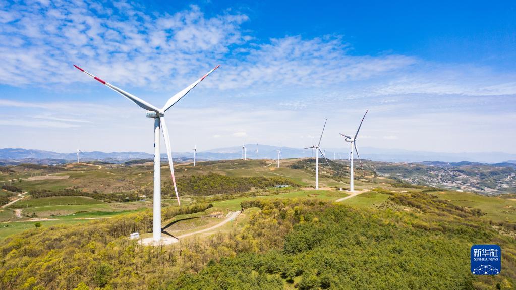 貴州省威寧彝族回族苗族自治縣雪山鎮(zhèn)的風力發(fā)電設備(2020年4月27日攝,無人機照片)。新華社記者 陶亮 攝