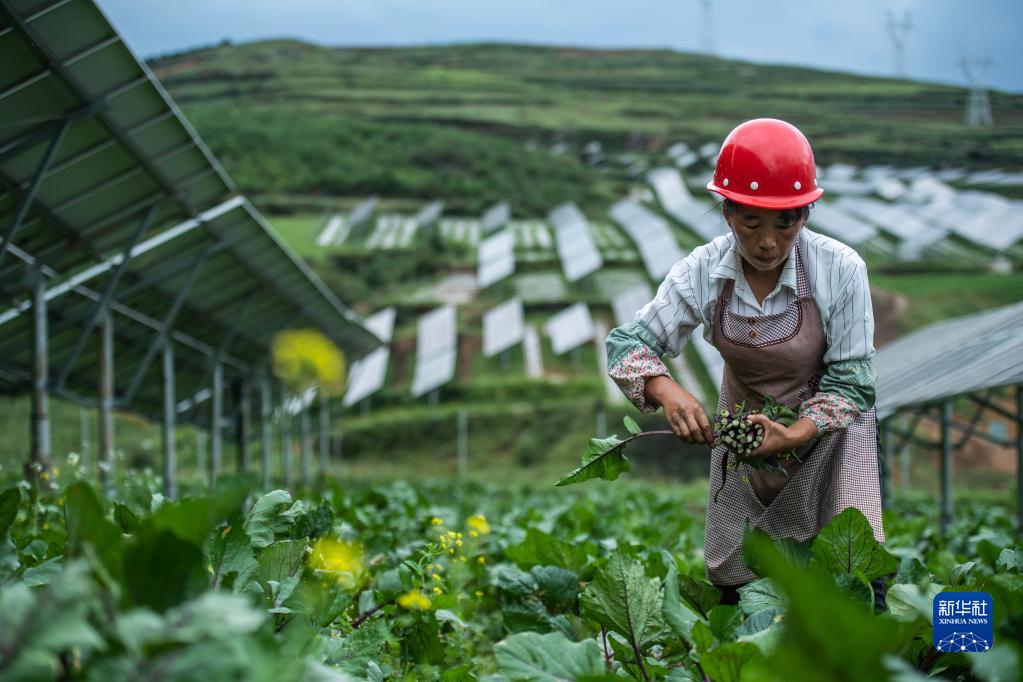 村民在貴州省威寧彝族回族苗族自治縣仙水窩光伏電站采摘紅菜苔(8月24日攝)。新華社記者 陶亮 攝