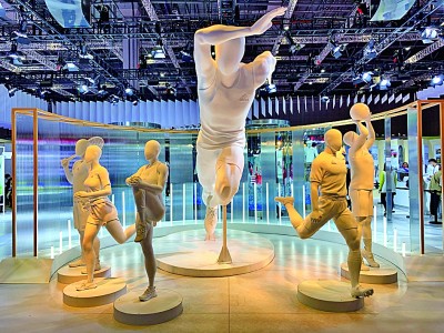 進(jìn)博會(huì)阿迪達(dá)斯展臺入口處的“全民健身,一起更強(qiáng)”主題雕塑。光明日報(bào)記者 曹元龍攝/光明圖片