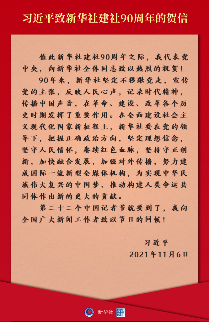今年11月6日,在新華社建社90周年之際,習(xí)近平總書記專門致信祝賀,寄語新華社:要在黨的領(lǐng)導(dǎo)下,把握正確政治方向,堅定理想信念,堅守人民情懷,賡續(xù)紅色血脈,堅持守正創(chuàng)新,加快融合發(fā)展,加強(qiáng)對外傳播,努力建成國際一流新型全媒體機(jī)構(gòu)。