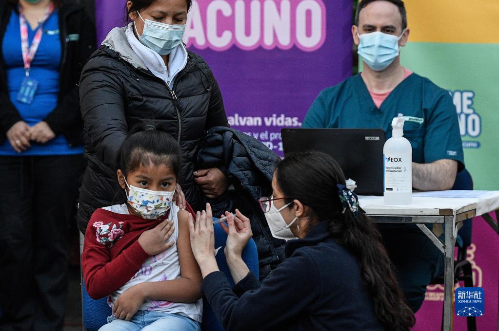 9月27日,一名兒童在智利首都圣地亞哥的普羅維登西亞學校接種科興新冠疫苗。新華社發(fā)(豪爾赫·比列加斯攝)
