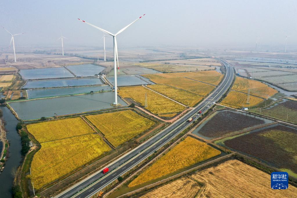 這是11月3日拍攝的江蘇省揚州市寶應縣魯垛鎮(zhèn)5.28萬千伏安風力發(fā)電項目(無人機照片)。新華社記者 李博 攝