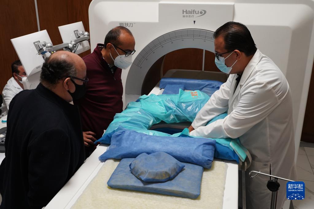 8月23日,在墨西哥普埃布拉州喬盧拉市腫瘤消融醫(yī)學中心,重慶海扶醫(yī)療的墨方合作醫(yī)生向到訪醫(yī)生演示“海扶刀”治療系統(tǒng)。新華社記者 朱雨博 攝