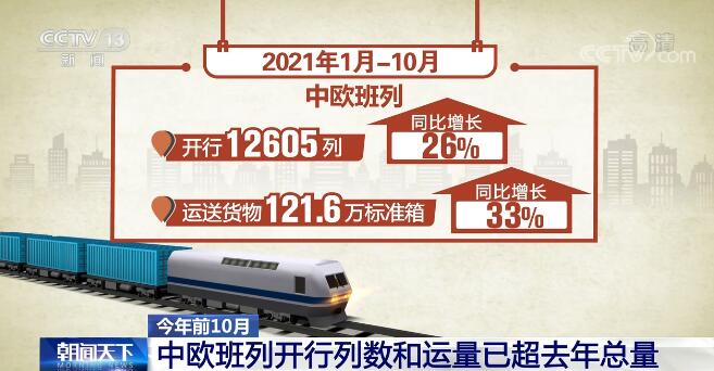 據(jù)了解,今年1月至10月,中歐班列開行12605列、運(yùn)送貨物121.6萬標(biāo)準(zhǔn)箱,同比分別增長(zhǎng)26%和33%;開行列數(shù)和運(yùn)量均超2020年全年總量,實(shí)現(xiàn)了班列開行數(shù)量和貨物發(fā)送量雙增長(zhǎng)。