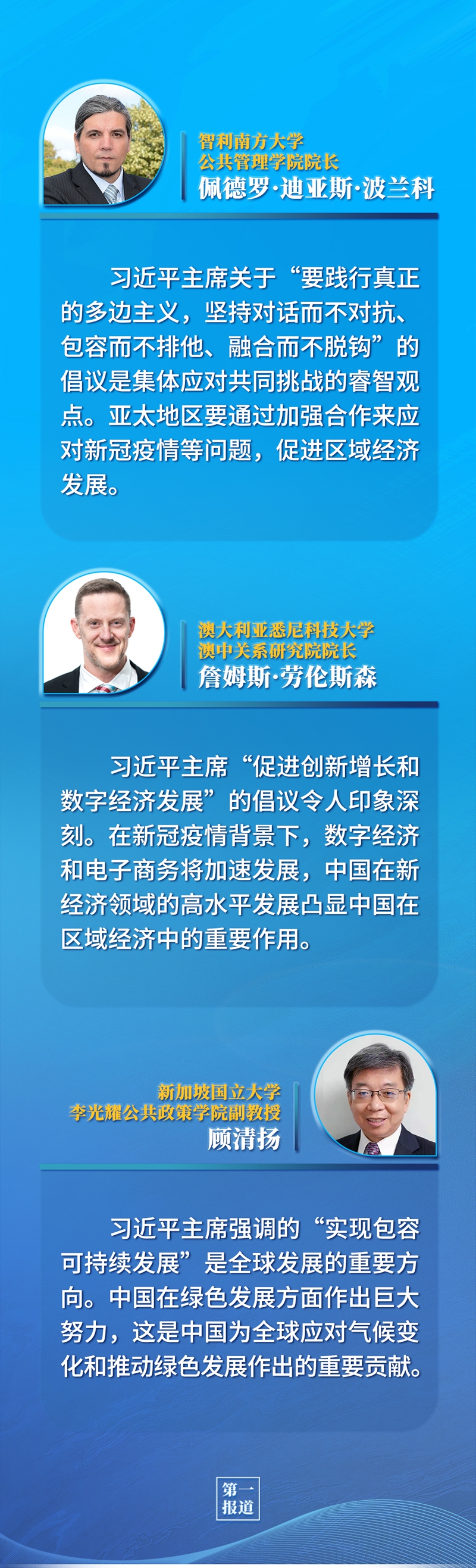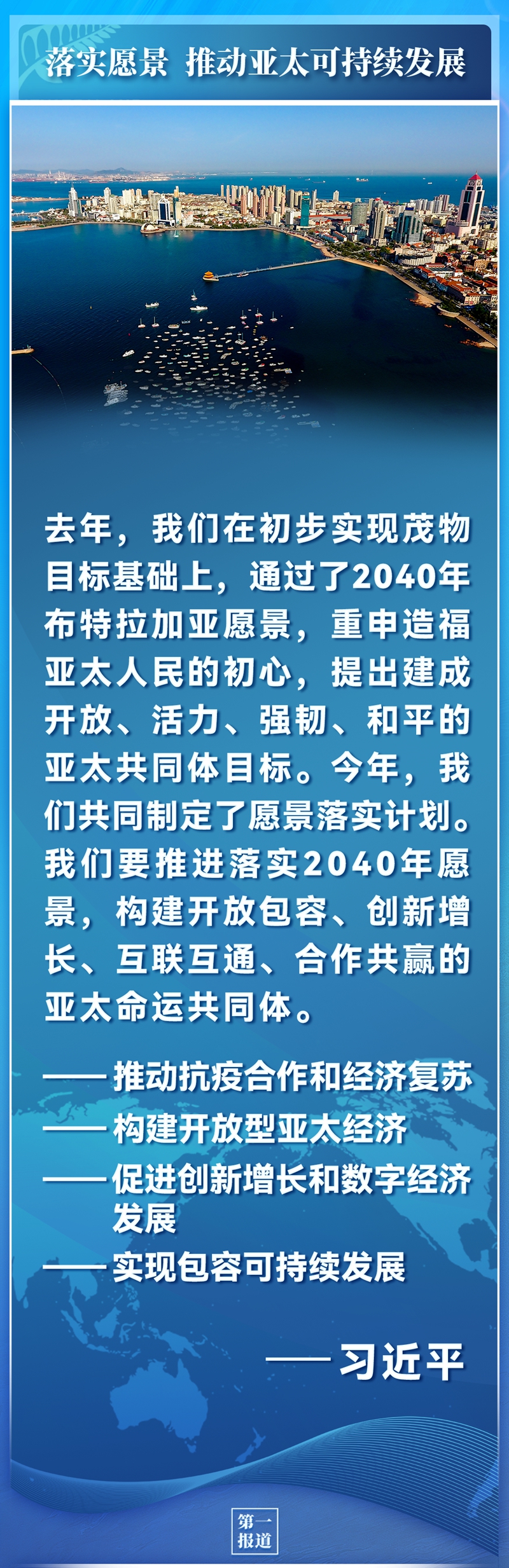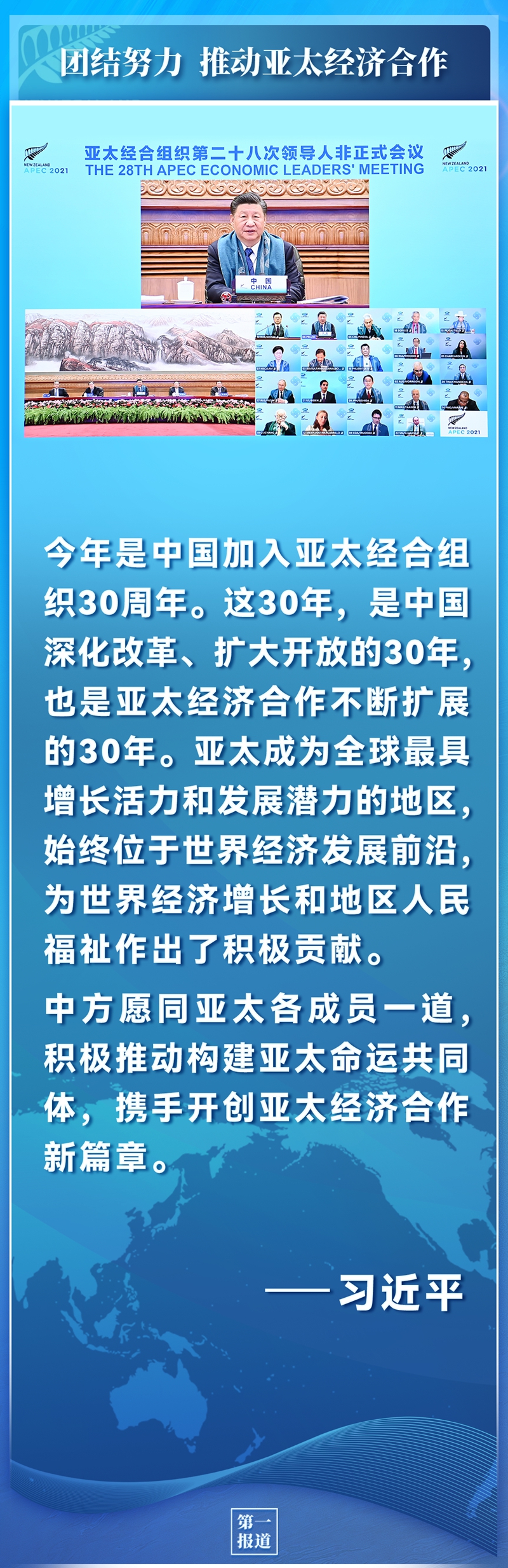 很高興同大家見面。首先,我感謝阿德恩總理和新西蘭政府為本次會議作出的努力。本次會議以“推動疫后經(jīng)濟復蘇,實現(xiàn)亞太人民和子孫后代的共同繁榮”為主題,具有十分重要的意義。