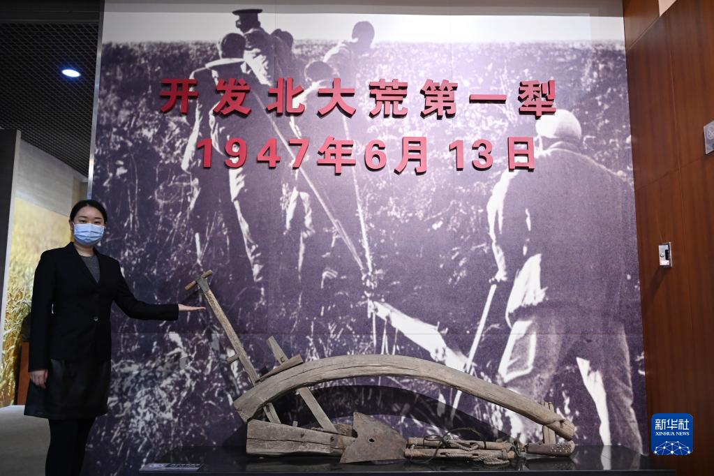 在北大荒博物館,工作人員介紹開發(fā)北大荒第一犁的歷史(2021年3月10日攝)。新華社記者王建威攝