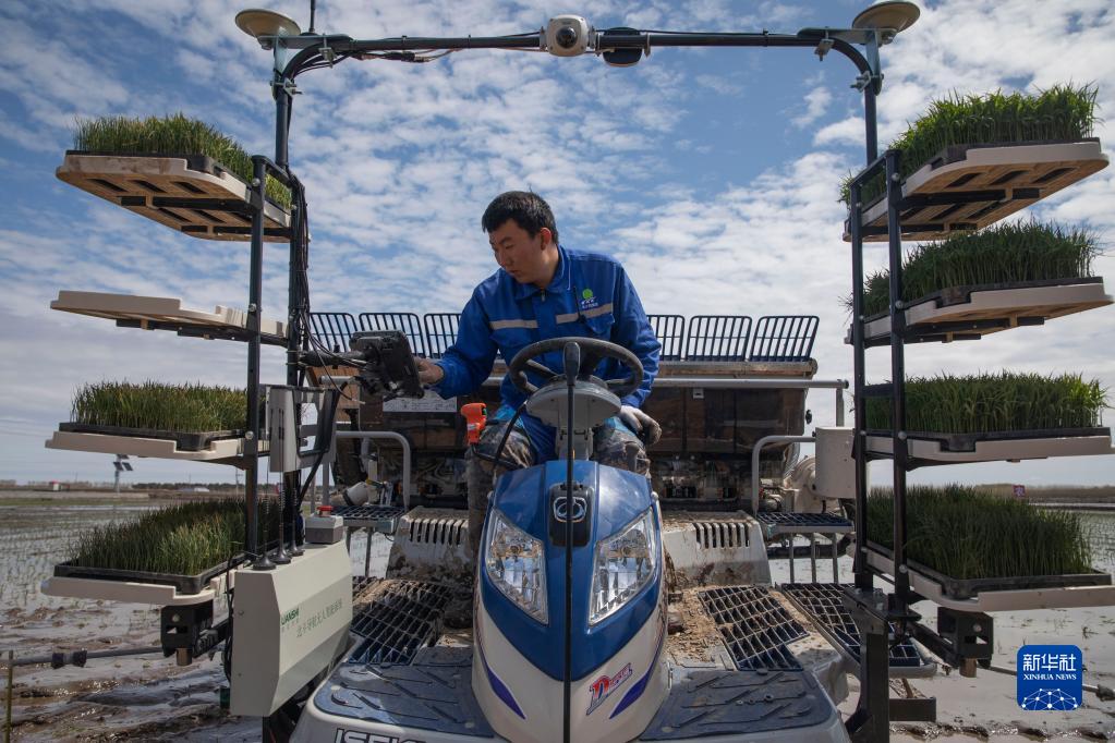 在北大荒集團紅衛(wèi)農(nóng)場有限公司智慧農(nóng)業(yè)先行示范區(qū)內(nèi),工作人員設(shè)置無人駕駛插秧機工作路徑(2021年5月11日攝)。新華社記者 張濤 攝