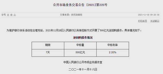 11月18日消息,央行公開市場(chǎng)開展500億元7天期逆回購(gòu)操作,中標(biāo)利率2.20%。Wind數(shù)據(jù)顯示,今日1000億元逆回購(gòu)到期。