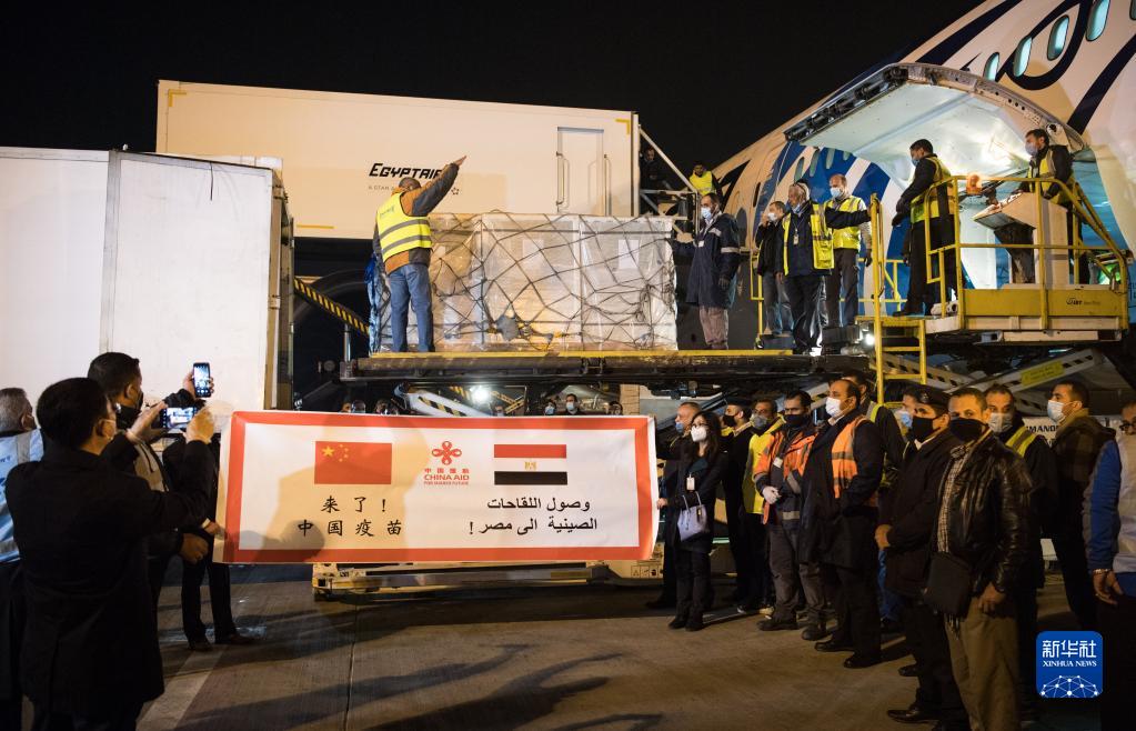 2月23日,在埃及開羅國際機場,工作人員運輸疫苗。中國援助埃及的首批新冠疫苗當日凌晨運抵開羅,援助阿盟秘書處的新冠疫苗也同機抵達。新華社記者 鄔惠我 攝