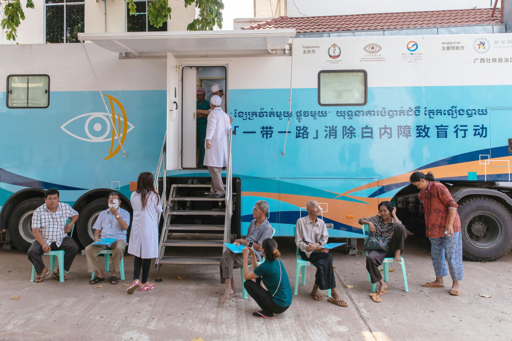 ↑2019年3月15日,在柬埔寨磅湛省醫(yī)院,白內(nèi)障患者在“一帶一路”消除白內(nèi)障致盲行動醫(yī)療隊的醫(yī)療車外等待接受手術(shù)治療。