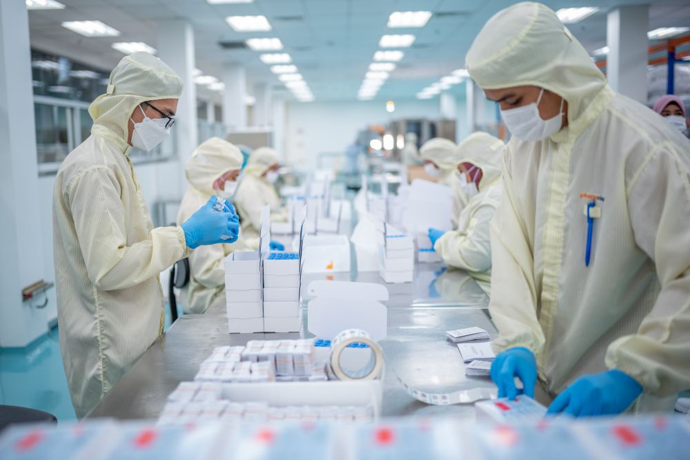↑2021年10月5日,在馬來西亞吉隆坡郊區(qū)的發(fā)馬公司灌裝工廠,工人在包裝本地灌裝生產(chǎn)的科興疫苗。本地灌裝中國疫苗已成為馬來西亞的驕傲。