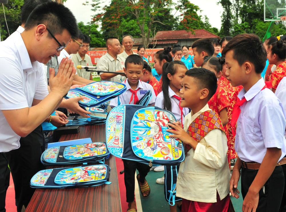 ↑2019年6月1日,在老撾萬象,中老友好農(nóng)冰村小學(xué)學(xué)生接過中老鐵路中國工作人員贈送的文具禮物。