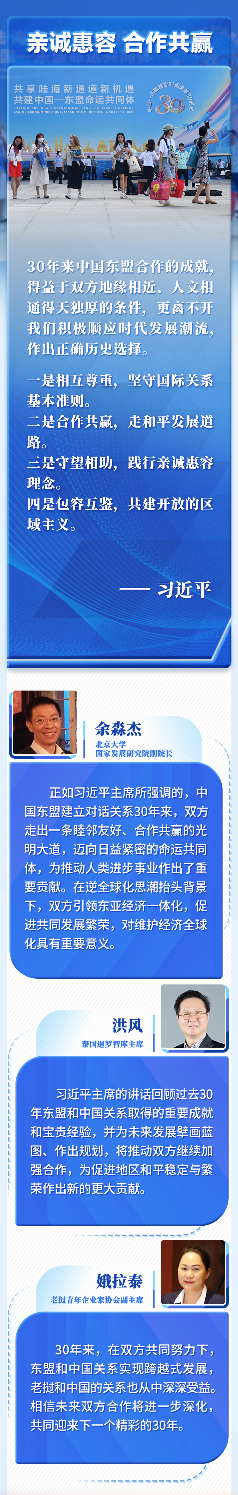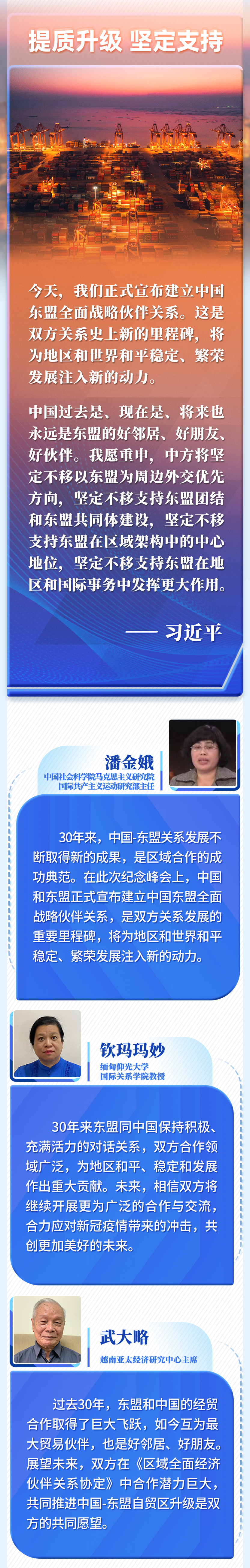 30年的寶貴經(jīng)驗是中國和東盟的共同財富,為雙方發(fā)展全面戰(zhàn)略伙伴關系奠定了基礎、提供了遵循。我們要倍加珍惜、長久堅持,并在新的實踐中不斷豐富和發(fā)展。