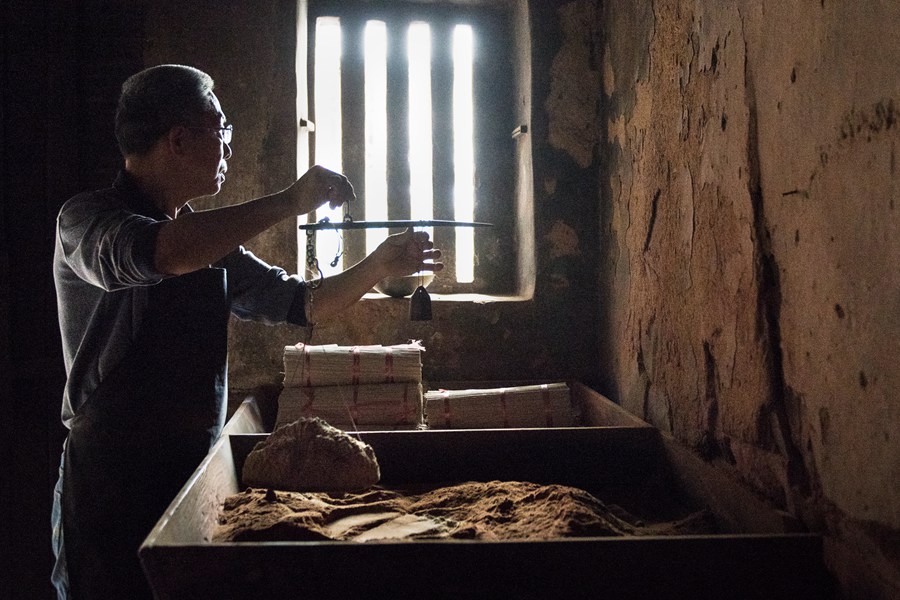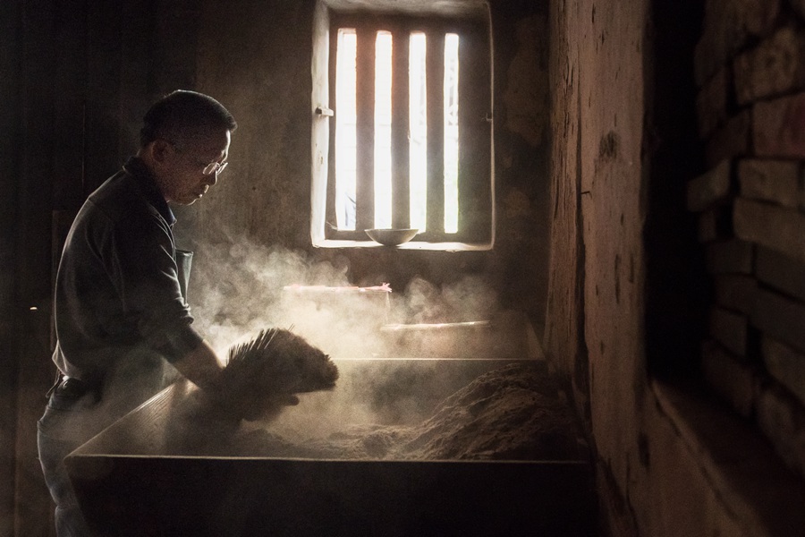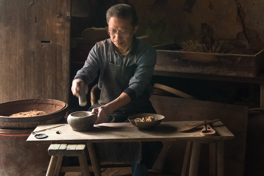 永春香制作技藝傳承人蒲良宮在制作原材料。張文慶攝