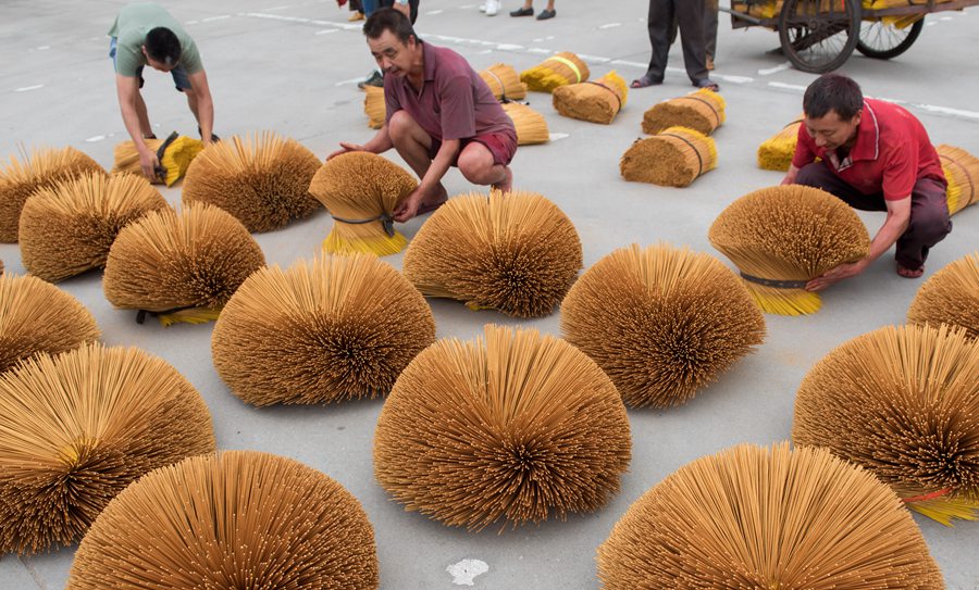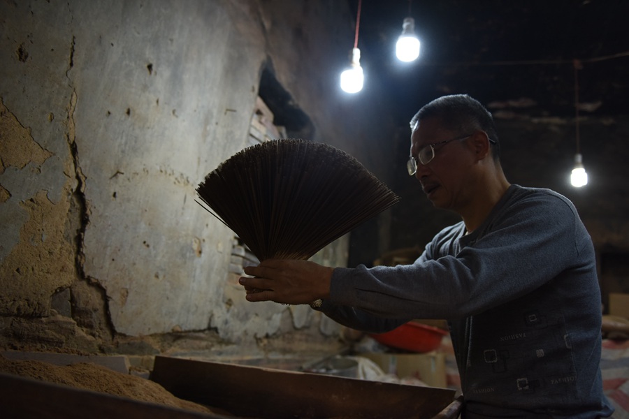 作為中外文明交匯的產(chǎn)物,永春香頗為講究“手藝”。沾水打底、展香、掄香、切香、染香、曬香、跺香……一尺長(zhǎng)的永春香背后,經(jīng)歷了十多道工序的層層疊加。