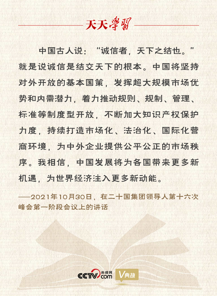 習(xí)近平主席今年以視頻方式出席二十國集團領(lǐng)導(dǎo)人第十六次峰會第一階段會議時指出,當(dāng)前,新冠肺炎疫情持續(xù)反復(fù),世界經(jīng)濟復(fù)蘇脆弱,氣候變化挑戰(zhàn)突出,地區(qū)熱點問題頻發(fā)。面對世界百年未有之大變局和世紀(jì)疫情,二十國集團作為國際經(jīng)濟合作主要論壇,要負起應(yīng)有責(zé)任,為了人類未來、人民福祉,堅持開放包容、合作共贏,踐行真正的多邊主義,推動構(gòu)建人類命運共同體。為此,習(xí)主席引用古語“誠信者,天下之結(jié)也”,向世界傳播中國聲音,傳達中國方案。