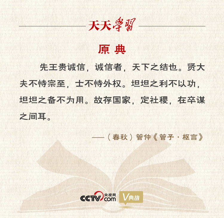 “誠信者,天下之結(jié)也”出自《管子·樞言》。結(jié):關(guān)鍵。意思是恪守誠信,是天下行為準(zhǔn)則的關(guān)鍵。