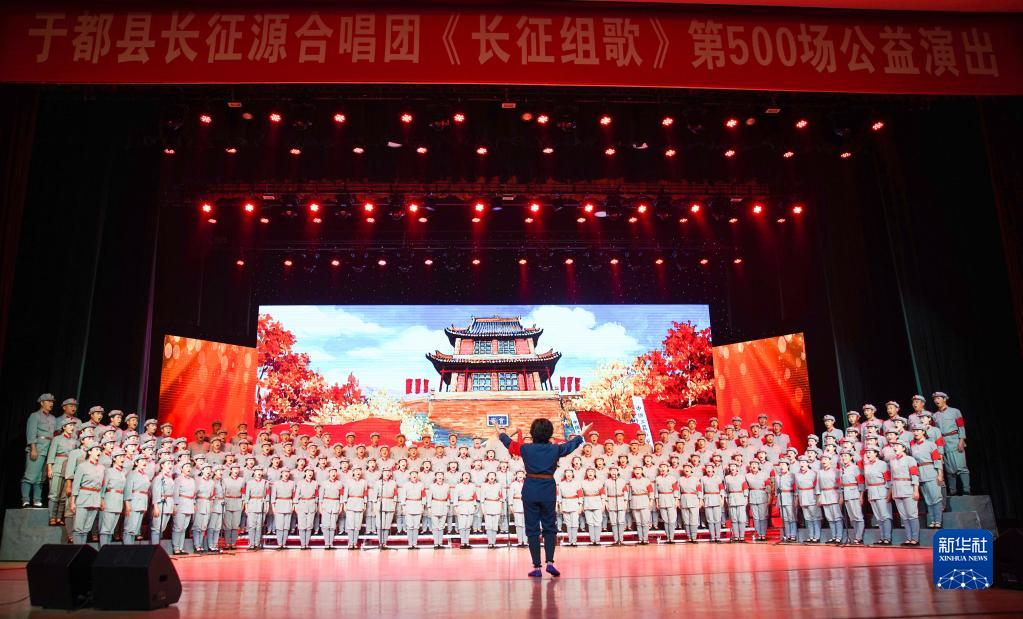 江西省于都縣長征源合唱團(tuán)在該縣文化藝術(shù)中心進(jìn)行第500場《長征組歌》公益演出(5月19日攝)。新華社記者 陳曄華 攝