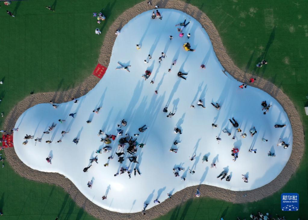 在江西省贛州市章貢區(qū)沙河鎮(zhèn)的羅坑體育特色小鎮(zhèn),游客在體驗(yàn)戶外蹦床項(xiàng)目(2020年11月15日攝,無人機(jī)照片)。新華社記者 彭昭之 攝