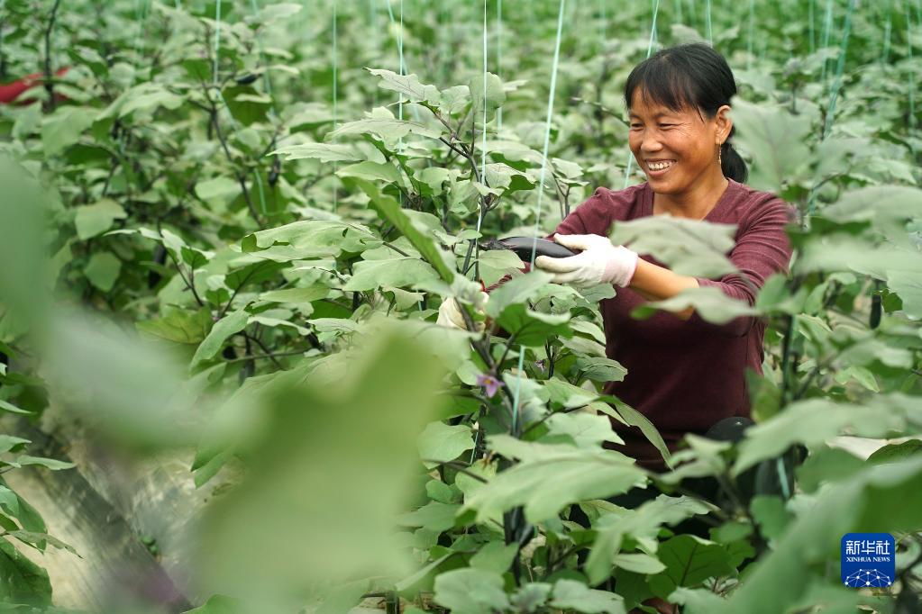 在江西省贛州市于都縣梓山鎮(zhèn)潭頭村的果蔬種植基地,村民在采摘茄子(2020年10月21日攝)。新華社記者 萬象 攝