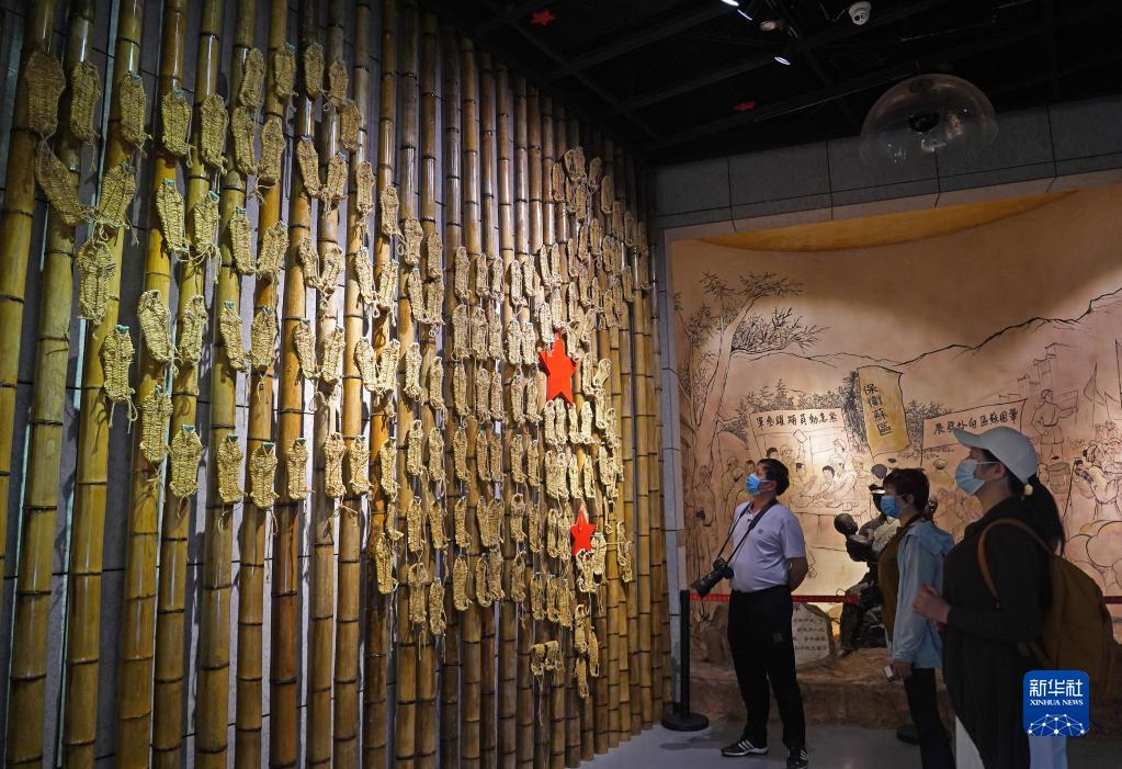在江西省于都縣中央紅軍長征出發(fā)紀(jì)念館,游客在參觀草鞋組成的“草鞋墻”(4月30日攝)。新華社記者 萬象 攝