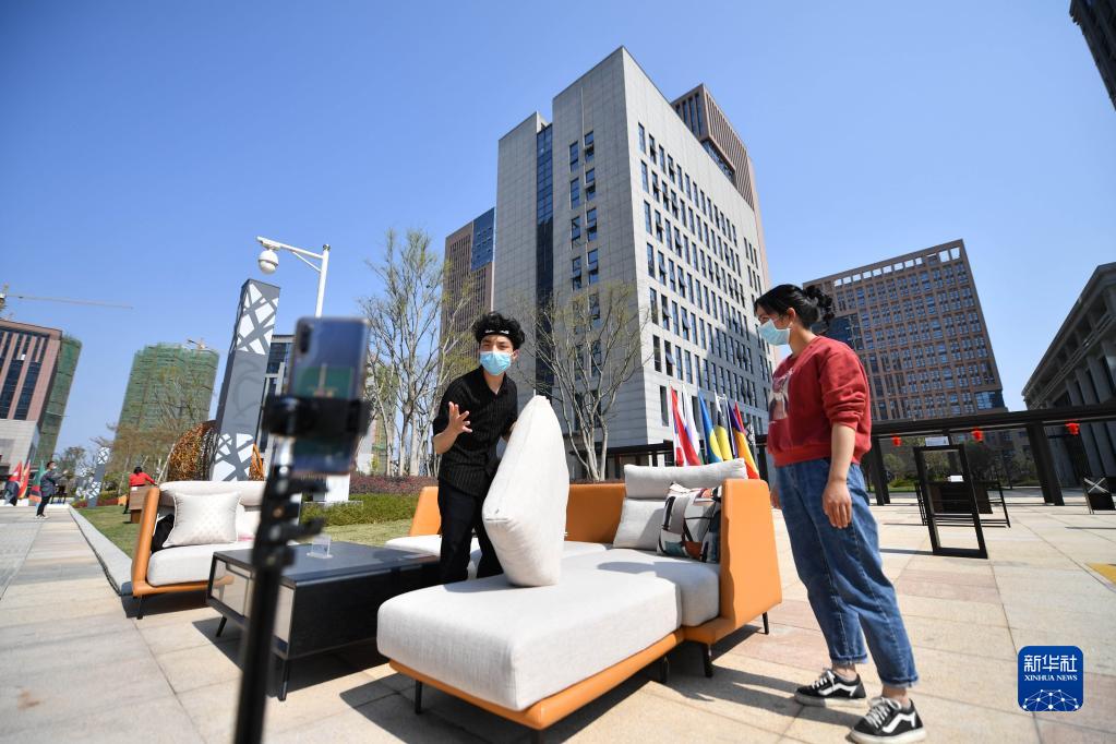 在江西省贛州市南康區(qū)跨境電商產(chǎn)業(yè)園,員工通過手機(jī)直播的形式推銷家具(2020年2月26日攝)。新華社記者 胡晨歡 攝
