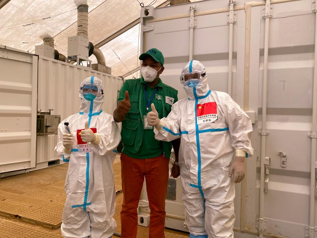 2020年9月2日,在幾內(nèi)亞首都科納克里一個(gè)核酸檢測(cè)取樣點(diǎn),中國(guó)抗疫醫(yī)療專家組成員與當(dāng)?shù)毓ぷ魅藛T合影。新華社發(fā)(專家組供圖)