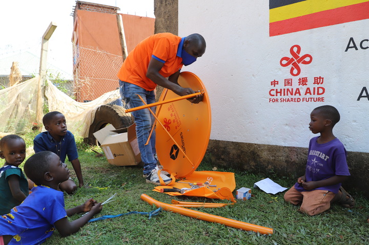 9月10日,技術(shù)人員在烏干達(dá)中部瓦基索區(qū)的布韋倫加村安裝調(diào)試數(shù)字電視設(shè)備。中國(guó)企業(yè)四達(dá)時(shí)代集團(tuán)承建的“萬(wàn)村通”項(xiàng)目讓這里的村民看上了畫面清晰而且免費(fèi)的衛(wèi)星數(shù)字電視節(jié)目。新華社記者張改萍攝