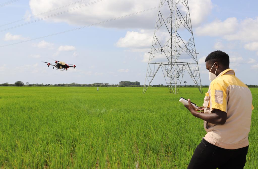 6月2日,在烏干達(dá)卡隆古區(qū)盧卡亞鎮(zhèn)中億農(nóng)業(yè)園,作業(yè)員赫伯特·阿加巴操控植保無(wú)人機(jī)噴灑農(nóng)藥。新華社記者張改萍攝