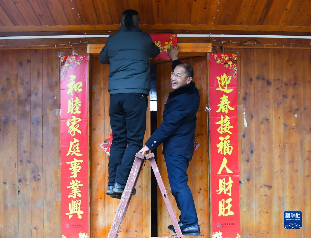 2021年2月5日,張忠富(右)在湖南省常德市石門縣金河村脫貧戶鄧先鶴家中與他一起貼春聯(lián)。新華社記者 薛宇舸 攝