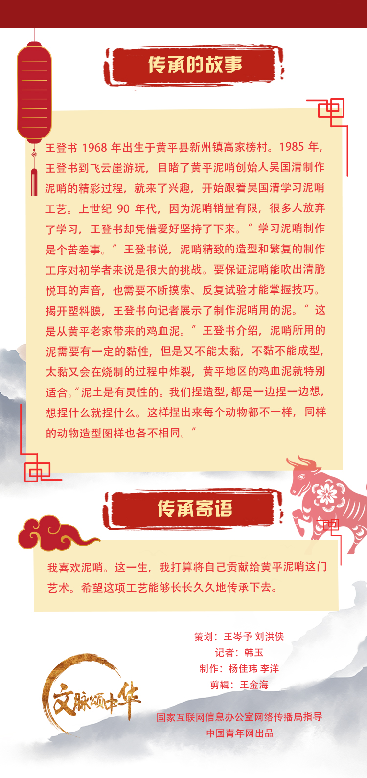 泥塑(苗族泥哨)國(guó)家級(jí)非遺代表性傳承人王登書(shū)上世紀(jì)八十年代師從黃平泥哨首創(chuàng)者吳國(guó)清,到如今從事泥哨創(chuàng)作已有三十多個(gè)年頭。他的作品質(zhì)樸簡(jiǎn)練、生動(dòng)傳神,具有極強(qiáng)的美學(xué)和文化內(nèi)涵。王登書(shū)創(chuàng)作時(shí)還擅長(zhǎng)將黃平泥哨與民間文化相結(jié)合,通過(guò)自己的手藝將對(duì)中國(guó)民間文化的理解表達(dá)出來(lái)。“我喜歡泥哨。這一生,我打算將自己貢獻(xiàn)給泥塑這門(mén)藝術(shù)。希望這項(xiàng)工藝能夠長(zhǎng)長(zhǎng)久久地傳承下去!蓖醯菚(shū)告訴記者。