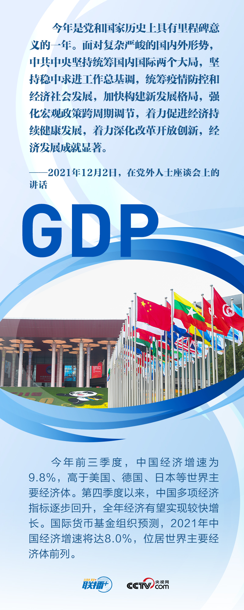“今年是黨和國家歷史上具有里程碑意義的一年。面對復(fù)雜嚴(yán)峻的國內(nèi)外形勢,中共中央堅(jiān)持統(tǒng)籌國內(nèi)國際兩個大局,堅(jiān)持穩(wěn)中求進(jìn)工作總基調(diào),統(tǒng)籌疫情防控和經(jīng)濟(jì)社會發(fā)展,加快構(gòu)建新發(fā)展格局,強(qiáng)化宏觀政策跨周期調(diào)節(jié),著力促進(jìn)經(jīng)濟(jì)持續(xù)健康發(fā)展,著力深化改革開放創(chuàng)新,經(jīng)濟(jì)發(fā)展成就顯著!痹邳h外人士座談會上,習(xí)近平總書記充分肯定2021年中國經(jīng)濟(jì)發(fā)展取得的成績。