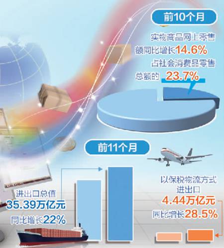 在消費資源全球化配置的今天,“買全球、賣全球”漸成新趨勢。作為消費新模式之一,跨境電商不僅是國內(nèi)國際雙循環(huán)的重要鏈接點,也為消費擴容提質(zhì)夯實了基礎。今年以來,新型消費業(yè)態(tài)和模式加速發(fā)展,國家統(tǒng)計局數(shù)據(jù)也印證了這一點:今年前10個月,實物商品網(wǎng)上零售額8.49萬億元,同比增長14.6%,占社會消費品零售總額23.7%。